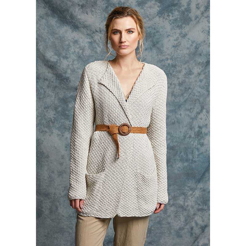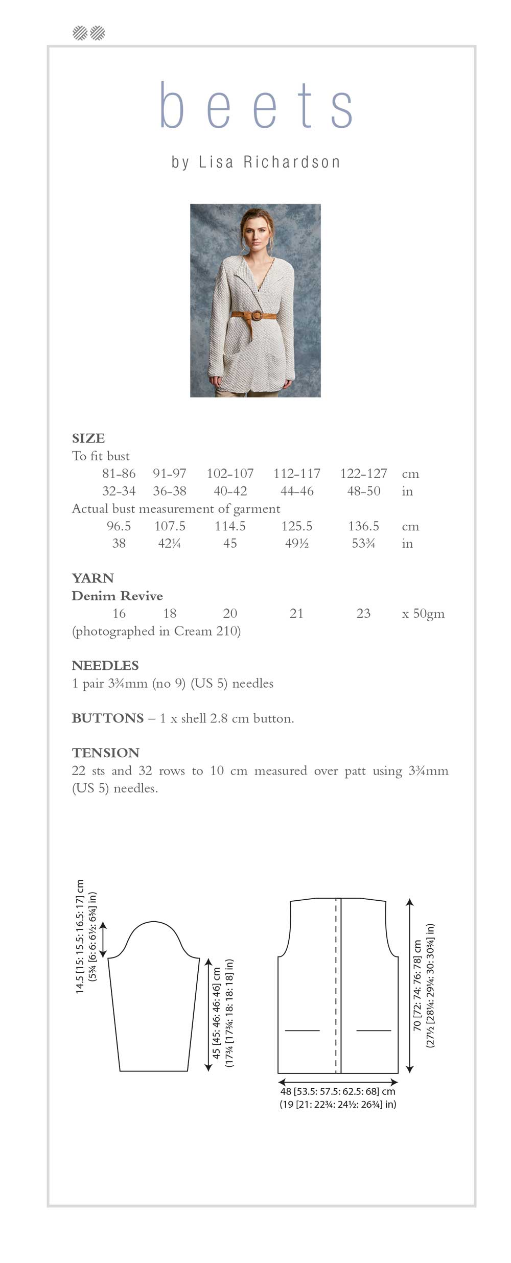 Designed by Lisa Richardson, this longline cardigan has deep pockets and an open front for a casual effect. Knitted in Denim Revive, using a double seed stitch pattern throughout, the designs also features long set-in sleeves and an open style collar.