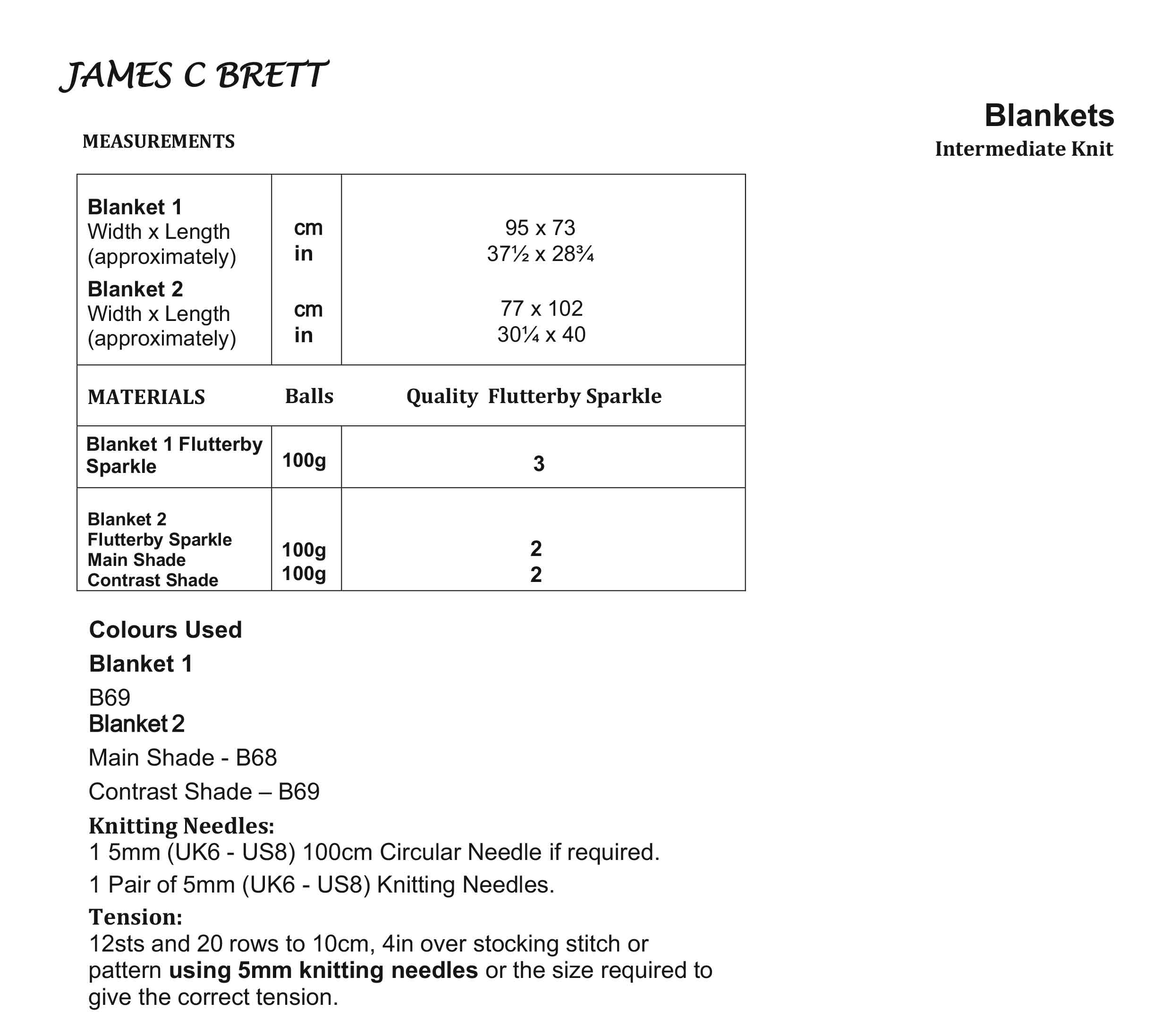 James C BrettBrand_James C BrettCollection Patterns and BooksFor_BabiesPatterns PaperPhysical PatternPopular Garments_BlanketsProduct Type_PatternsTechnique_KnitWool Weight_BabyWool Weight_Chunkyadd-to-cart2025-04-11//www.blacksheepwools.com/cdn/shop/files/JB986-Materials-Box.jpg?v=174360042346348024840436Default Title3,95//www.blacksheepwools.com/cdn/shopifycloud/storefront/assets/no-image-2048-a2addb12.gifhttps://www.blacksheepwools.com/en-ie/products/blankets-in-james-c-brett-flutterby-sparkle-chunky?variant=46348024840436InStockDefault Title