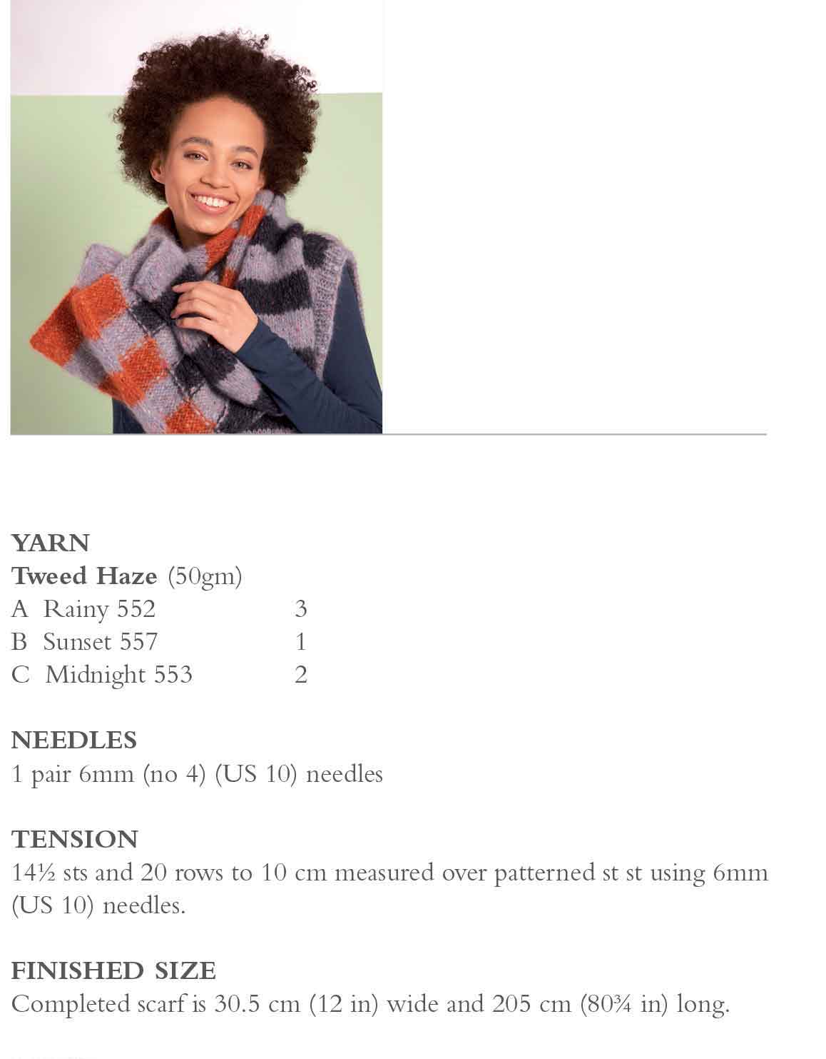 Turn heads with this striking scarf from Chloe Thurlow. Three contrasting shades of Tweed Haze are worked in alternating blocks of intarsia resulting in a fun autumnal accessory.
