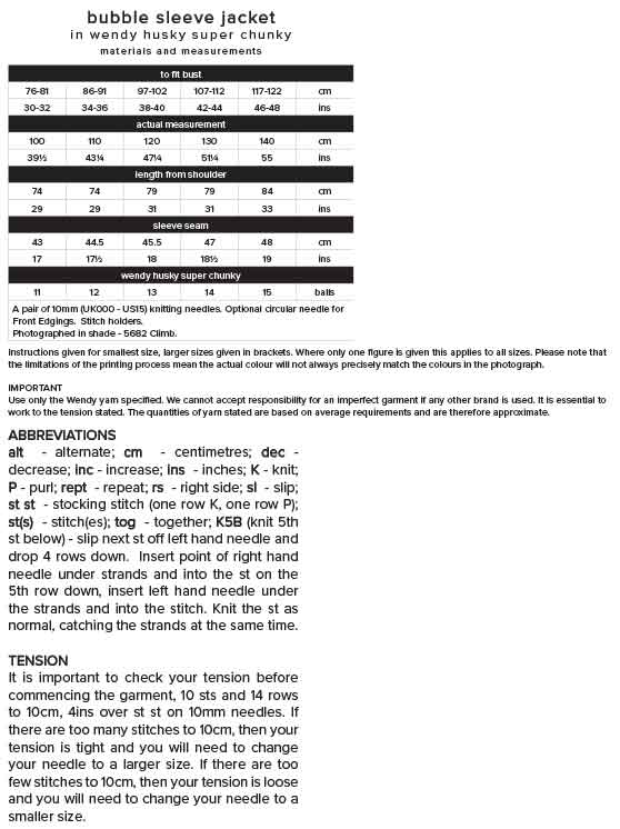 WendyBrand_WendycardiCollection Patterns and BooksFor_WomenPatterns PaperPhysical PatternPopular Garments_Cardigans and BolerosPopular Garments_Jackets and CoatsProduct Type_Patternssuper chunkyTechnique_KnitWool Weight_Super Chunkyadd-to-cart2023-09-20//www.blacksheepwools.com/cdn/shop/files/6171-Materials-Box.jpg?v=169521462244142774092020Default Title3,95//www.blacksheepwools.com/cdn/shopifycloud/storefront/assets/no-image-2048-a2addb12.gifhttps://www.blacksheepwools.com/en-ie/products/bubble-sleeve-jacket-in-wendy-husky-super-chunky?variant=44142774092020InStockDefault Title