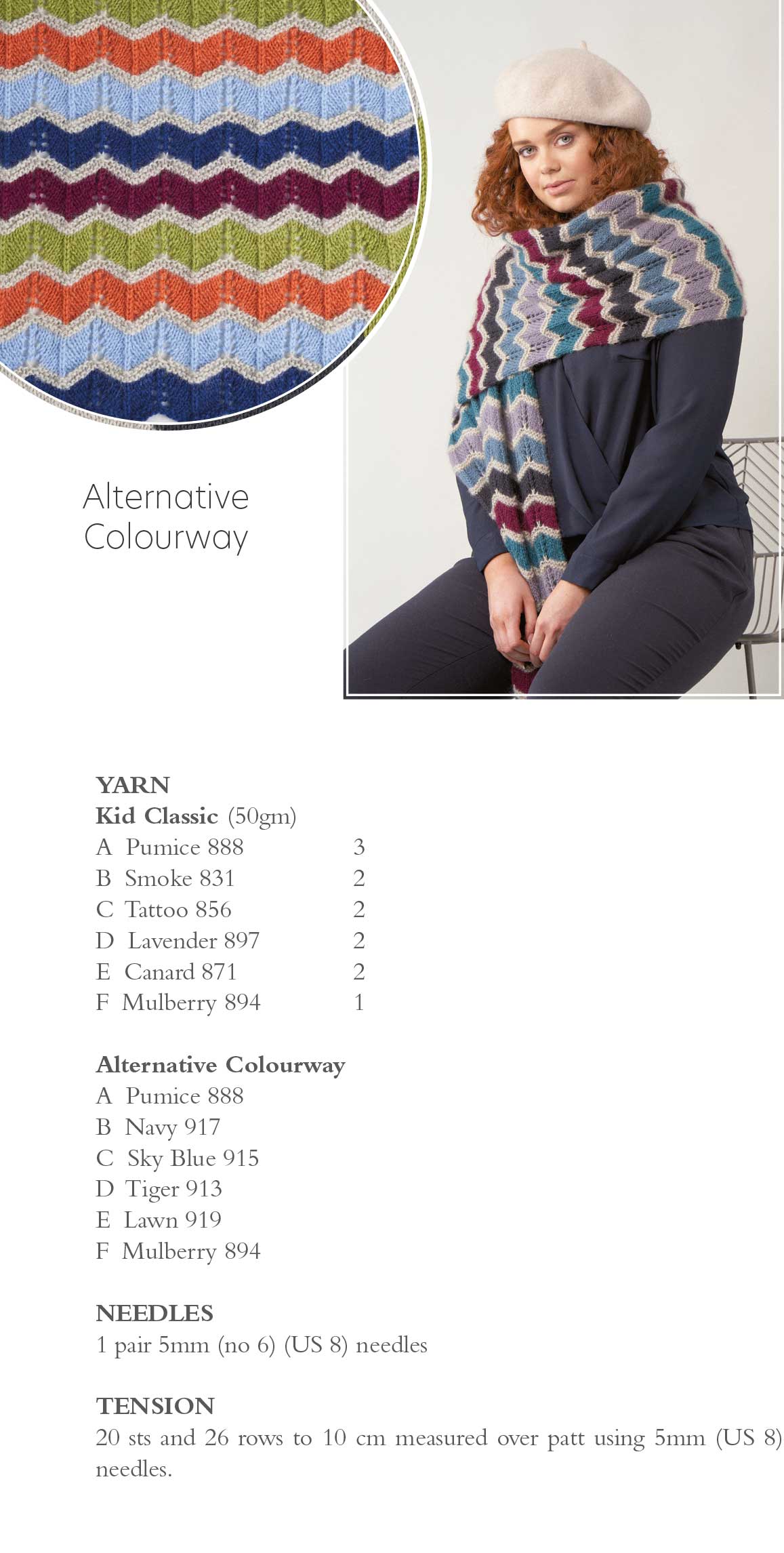 Martin Storey has used a carefully curated palette of six shades of Kid Classic for this eye-catching scarf. Deep bands of chevrons are bordered by garter stitch ridges, making the jewel-like tones pop. Calypso is knitted in two pieces which are grafted together at the centre, giving each end of the scarf a unique chevron edge. This wide scarf is a stylish, yet practical, winter accessory.
