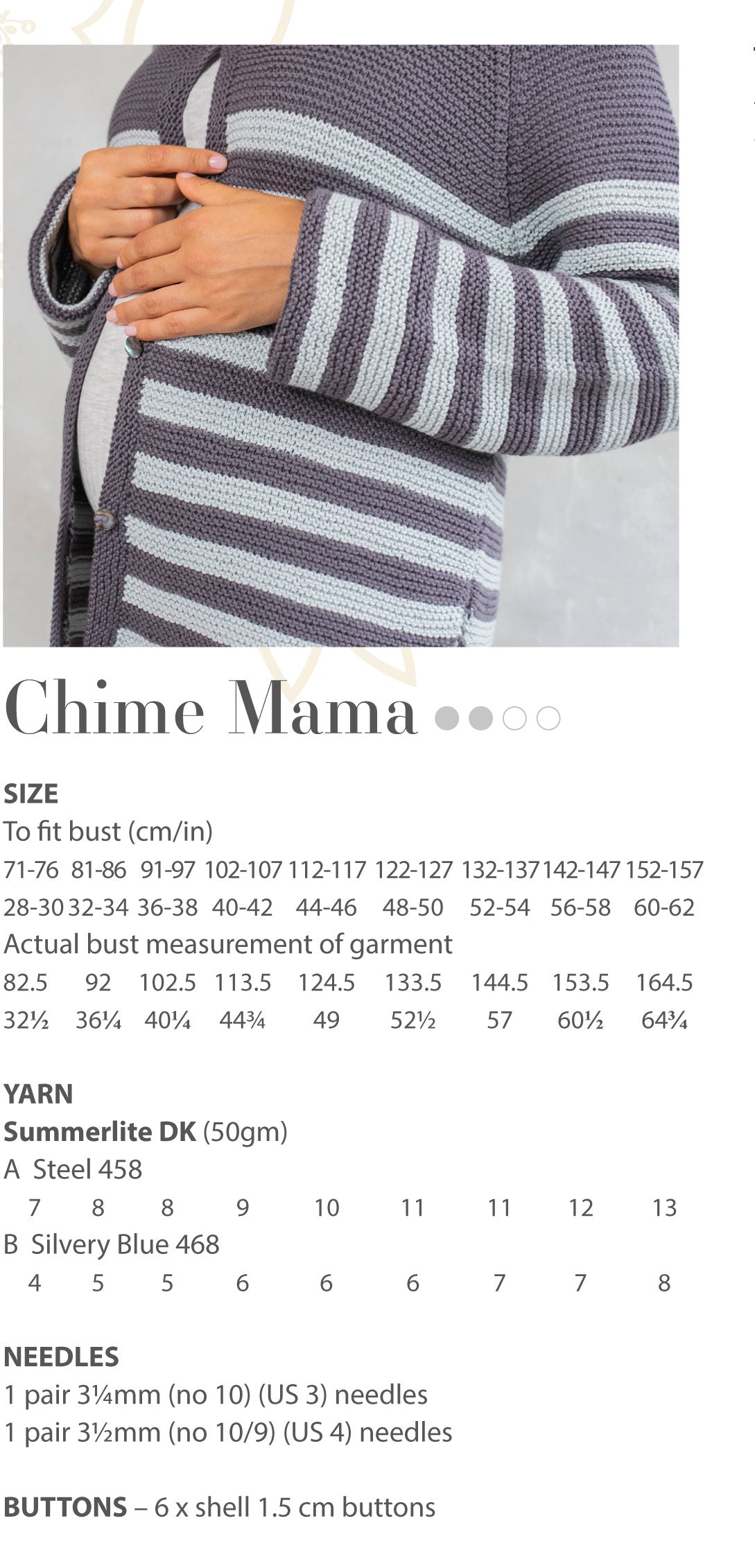 This easy to knit cardigan has a striped garter stitch texture. The raglan shaping and button fastenings creates a timeless piece for your wardrobe. Knit Chime Baby so you can match with your little one.