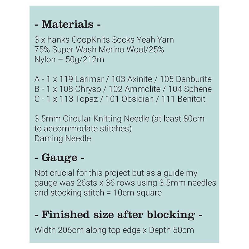 Faded lines and lace sections using simple yarn overs, make this a perfect project for a novice or more experienced knitter alike, whith plenty going on to keep you interested, and the shade and size of this shawl offering ample opportunity to play around with many different styling options.