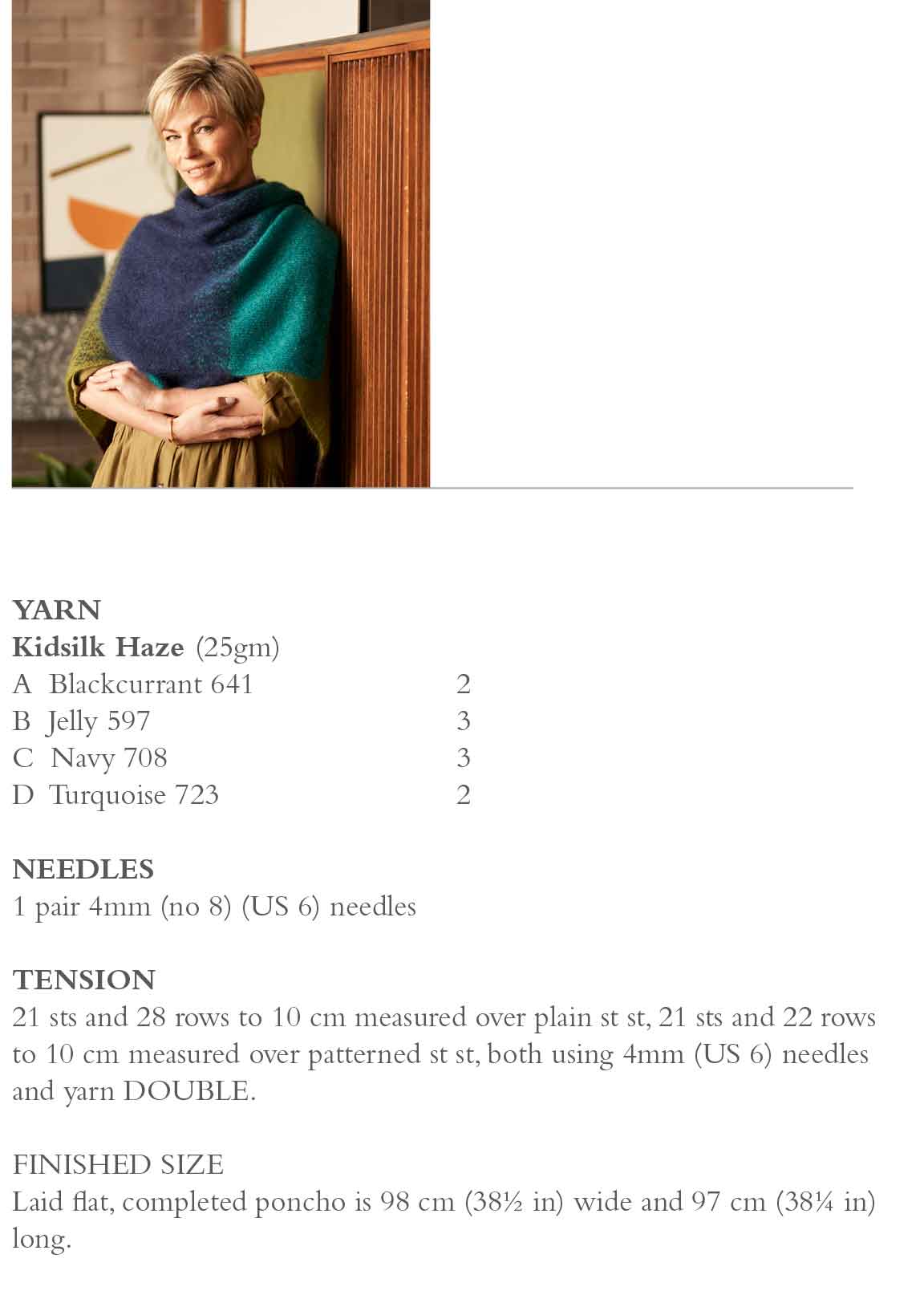 This pattern appears in Rowan Kidsilk Haze Accessories. Beautiful and interesting-to-knit accessories in the wonderful Kidsilk Haze, these designs are a joy to both knit and wear in equal measure. Designers Kaffe Fassett, Georgia Farrell, Lisa Richardson, Chloe Thurlow and Anna Hull combine simple stitches with a variety of shapes and techniques, intricate lace and stripes of colour to bring us a stunning collection of wraps, scarves, shawls and ponchos