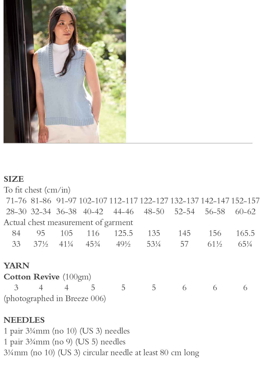 This pattern appears in Rowan Cotton Revive Collection. Ideal for those who prefer to wear cotton all year round and created using 100% recycled yarn, Cotton Revive, this versatile collection includes relaxed layers which will take you easily from one season to the next. Designers Martin Storey, Chloe Thurlow and Lisa Richardson have taken full advantage of Cotton Revive’s beautiful stitch definition with crochet, simple lace, cables and textured stitches, as well as easy-to-wear stocking stitch knits.