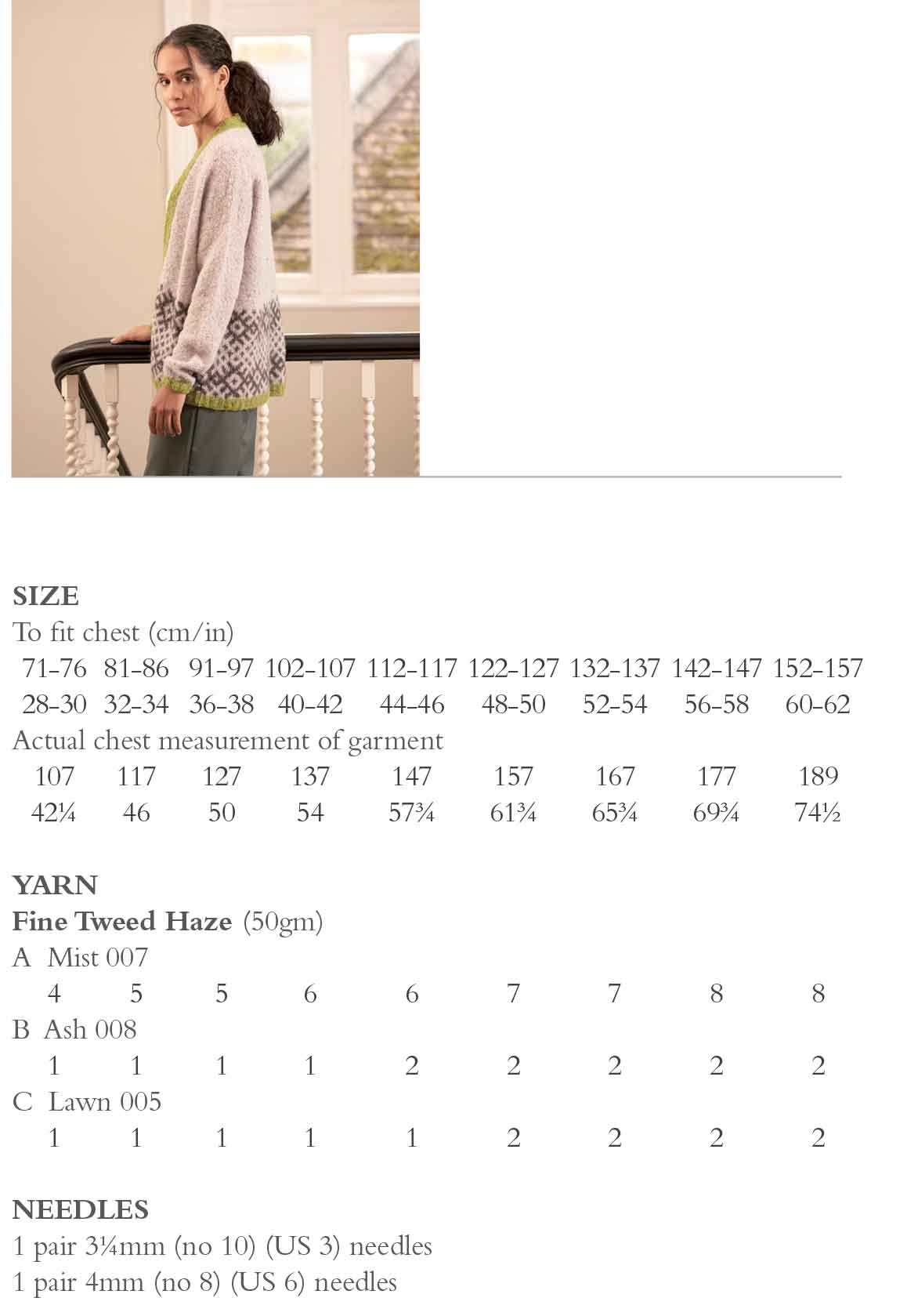 Texture and Fair Isle are cleverly combined in this relaxed cardigan from Martin Storey. Knitted using Fine Tweed Haze, the textured diamond pattern echoes the lovely deep band of Fair Isle below. A contrasting trim adds a touch of zest to this stylish cardigan.