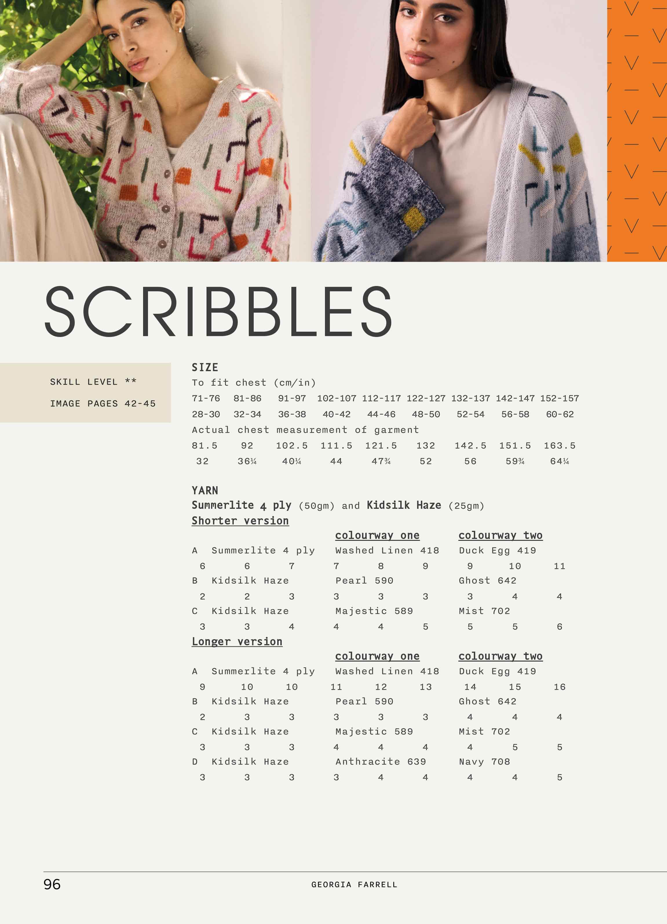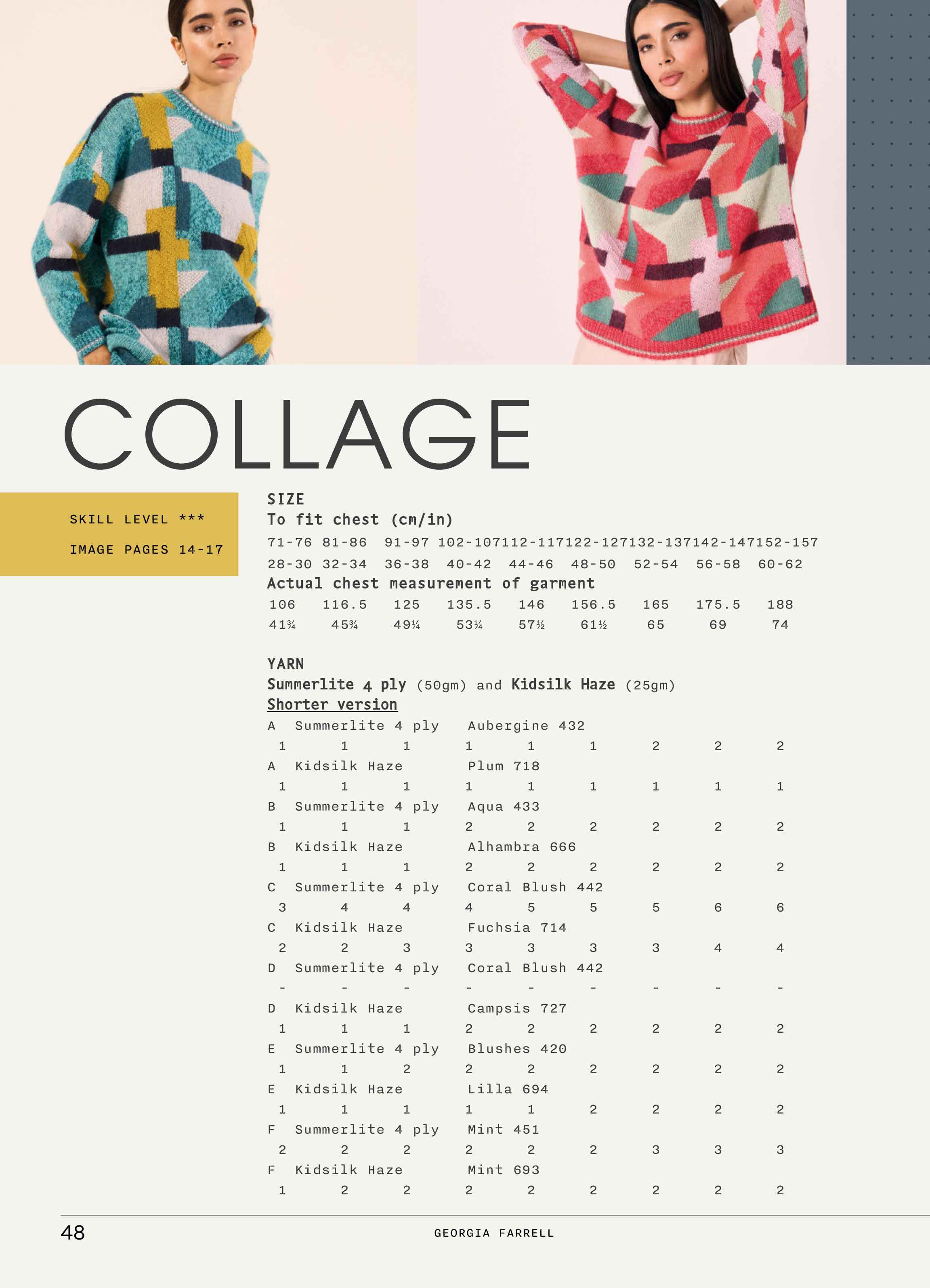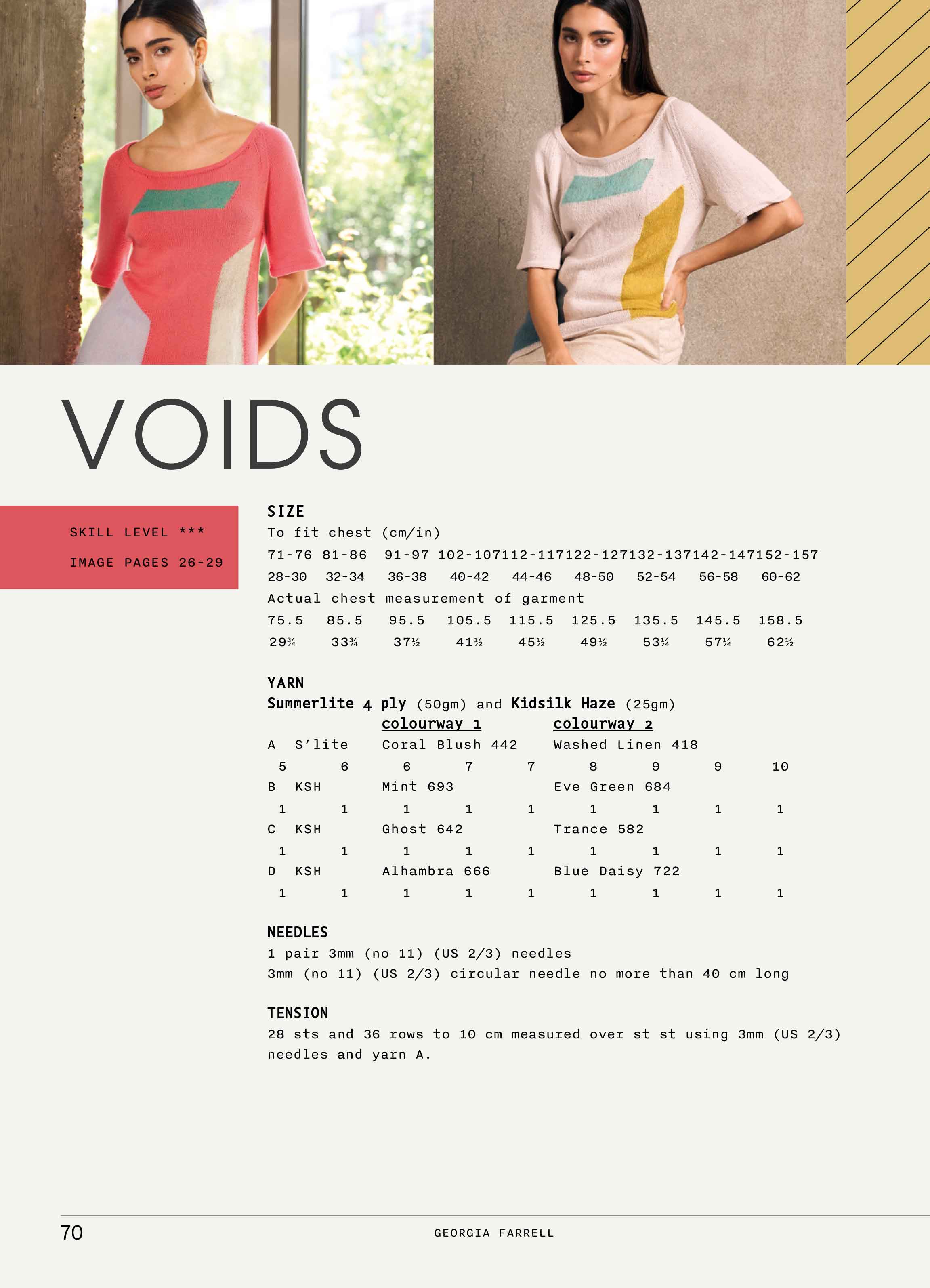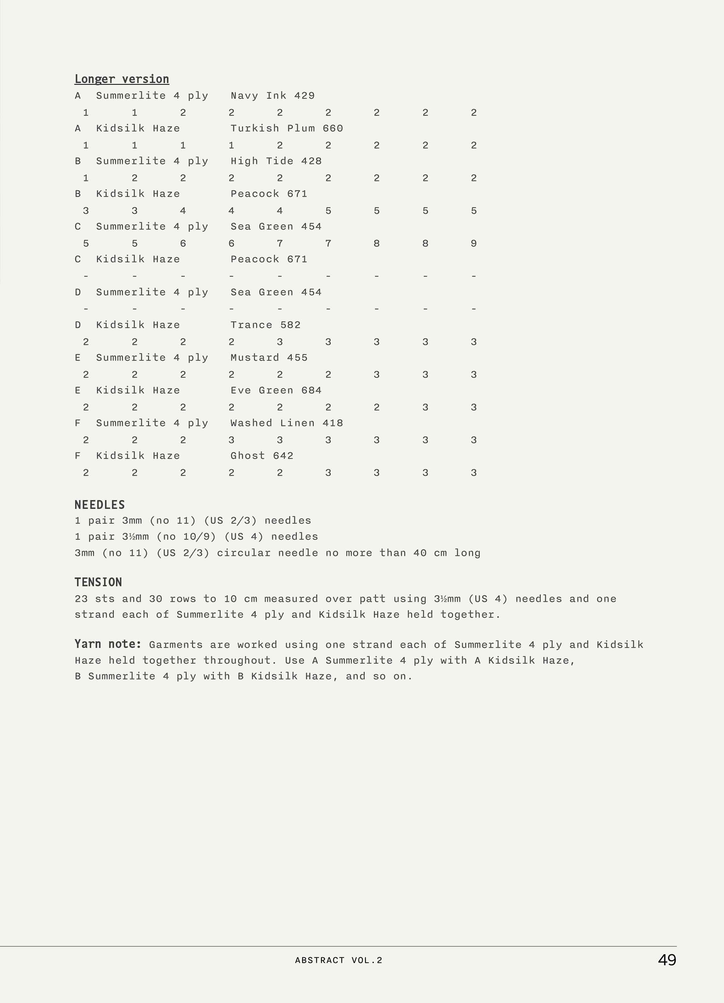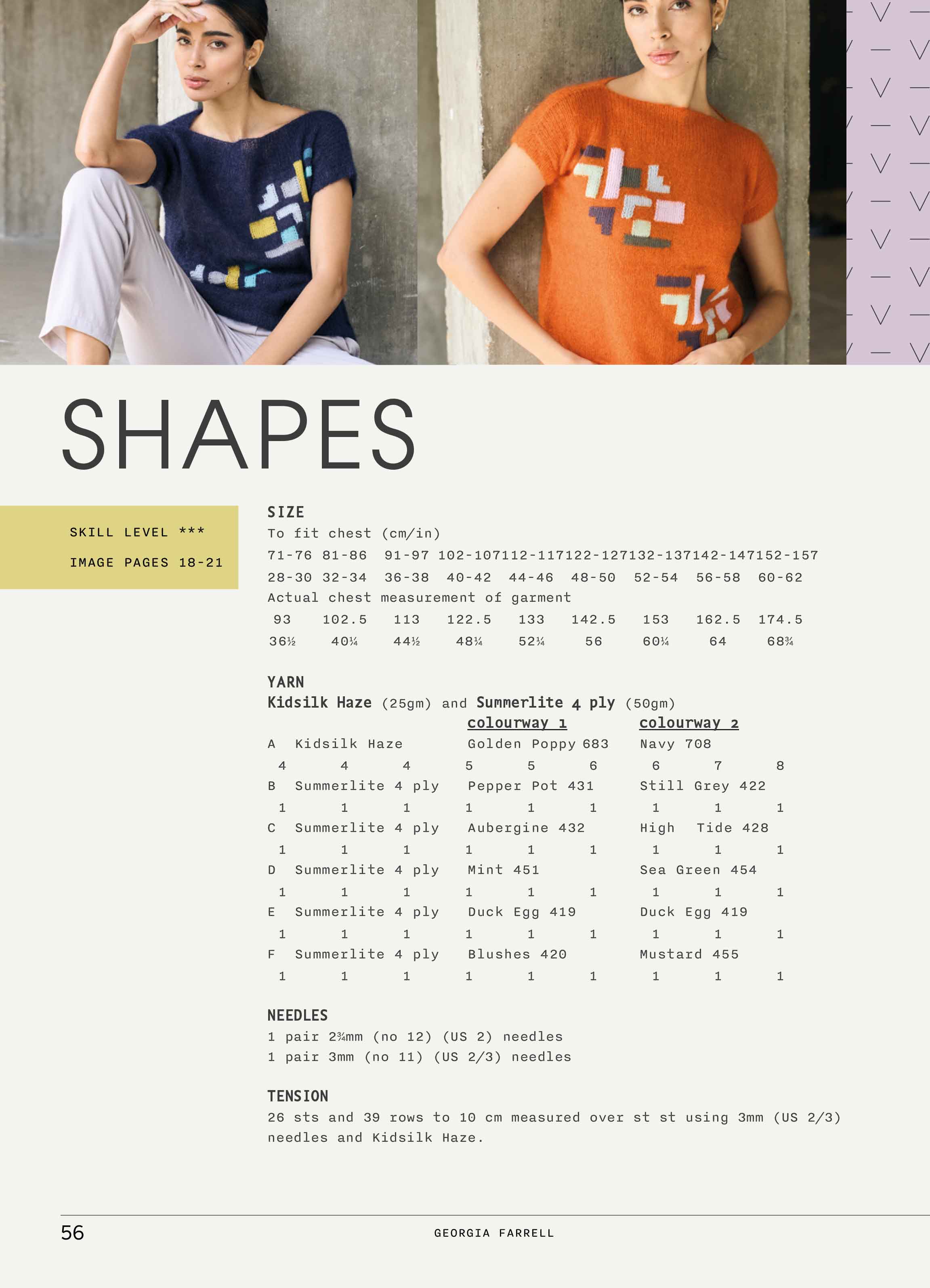 Abstract Vol 2 is the highly anticipated follow up to Georgia Farrell’s original Abstract collection. Building upon the strong graphic feel of the first collection, Georgia has carefully balanced a mix of tessellating, geometric patterns and collage-style colour blocks through the use of contrasting lines, angles and shapes. Featuring two yarns – Summerlite 4ply and Kidsilk Haze – this collection of eight designs including sweaters, tees and cardigans, offers different options and a choice of punchy, fresh colourways.