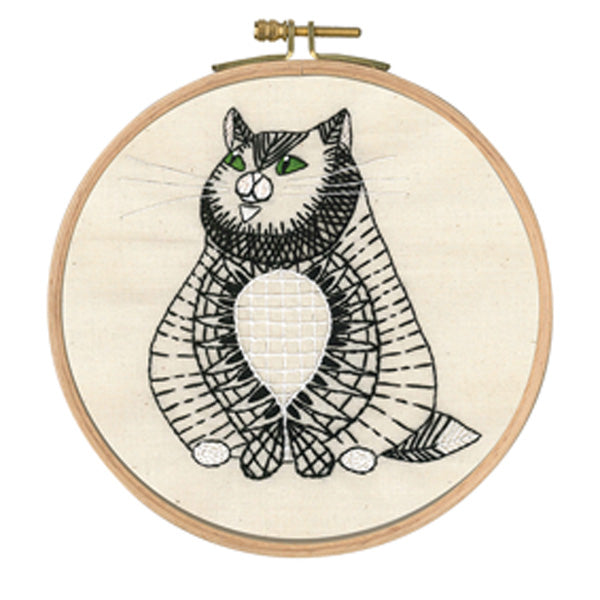 Kit contains: DMC 6 strand Mouline thread, printed calico fabric, embroided chart with stitch diagrams, needle, wooden embroidery hoop. Size: 15 x 15 cm