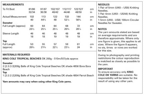 King ColeBrand_King ColeCollection Patterns and BooksPatterns PaperPhysical PatternPopular Garments_Sweaters and JumpersPopular Garments_TopsProduct Type_PatternsTechnique_KnitType_Inclusive SizingWool Weight_Dkadd-to-cart2023-04-18//www.blacksheepwools.com/cdn/shop/products/5977m-500x331.jpg?v=1681817097//www.blacksheepwools.com/cdn/shop/products/5977b-500x707.jpg?v=168181709543895634952436Default Title3,95//www.blacksheepwools.com/cdn/shopifycloud/storefront/assets/no-image-2048-a2addb12.gifhttps://www.blacksheepwools.com/en-ie/products/sweater-and-top-in-king-cole-tropical-beaches-dk-1?variant=43895634952436InStockDefault Title