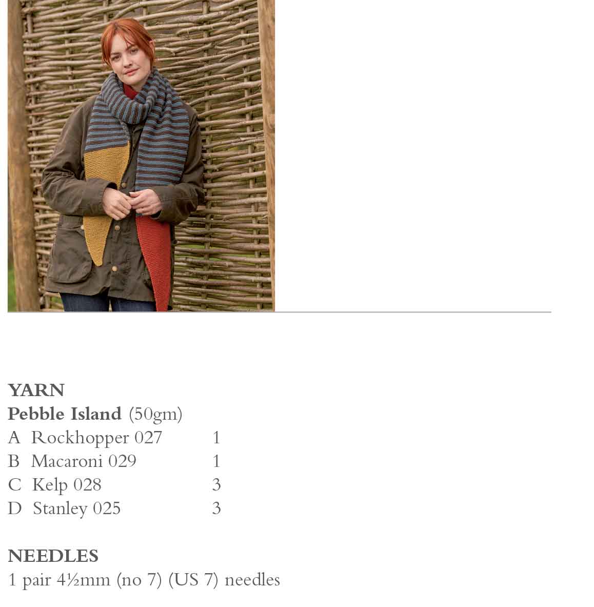 This pattern appears in Rowan Woodland . Pebble Island is a fully traceable and luxurious pure merino wool. In his Woodland collection, designer Martin Storey takes this exceptional yarn and creates an autumnal ensemble of stylish garments and accessories. Featuring beautiful colourwork alongside Martin’s trademark textures, this collection is the ideal showcase for this very special yarn.