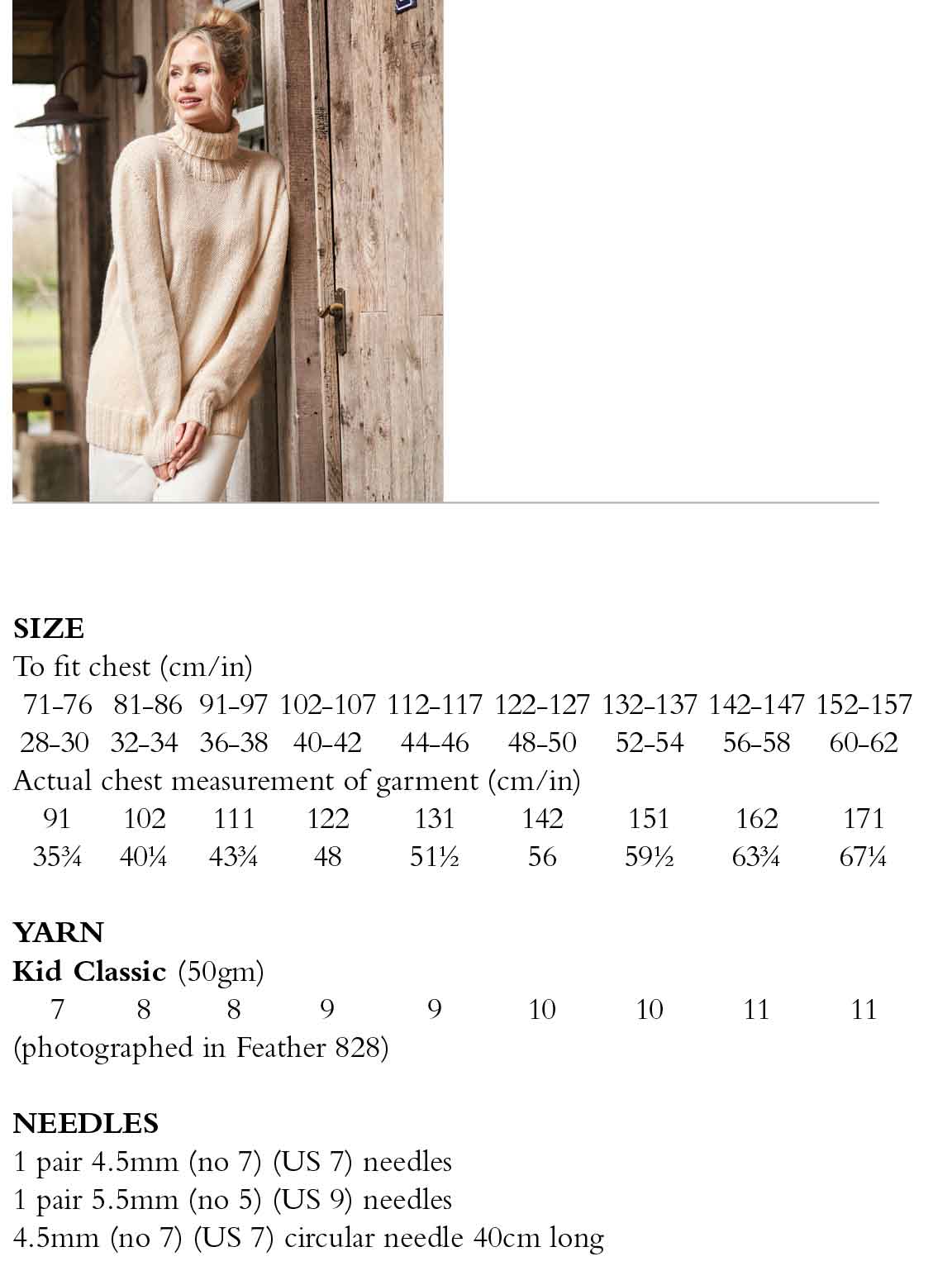 A lambswool and mohair blend, Kid Classic is the perfect choice for cosy winter knits. This long length roll neck sweater from Quail Studio is both relaxed and stylish and can be dressed up or down this autumn.