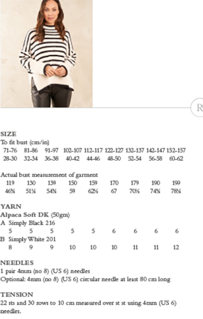 This relaxed sweater from Quail Studio is knitted using Alpaca Soft DK. Bold stripes are edged with a deep ribbed hem and cuffs, which are stylishly tipped with the contrasting shade. Flattering side splits add to the easygoing nature of this essential sweater.