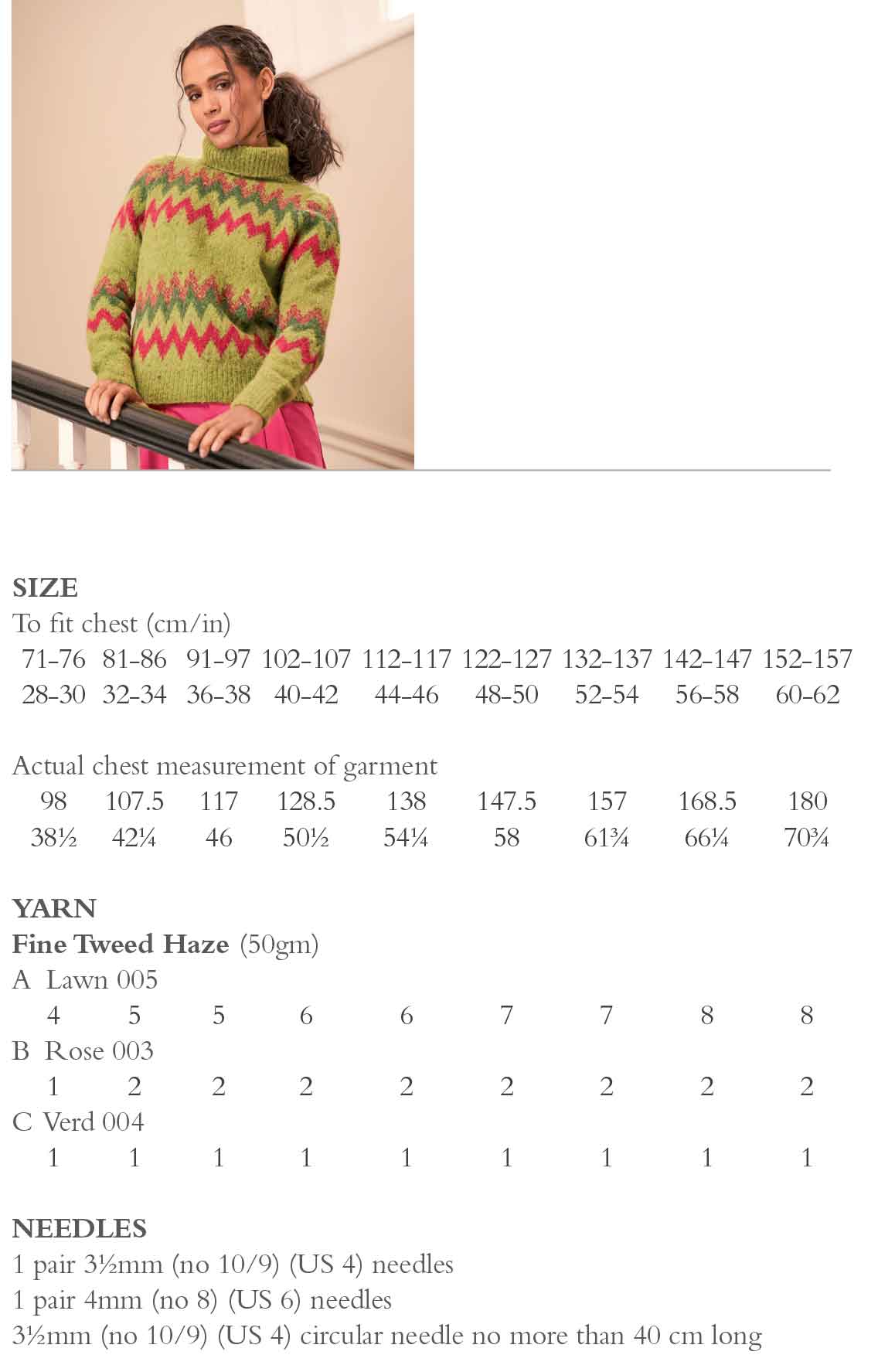 Striking bands of colour elevate this classic roll neck sweater by Chloe Thurlow. Worked in three shades of Fine Tweed Haze, bold Fair Isle zig zags make a delightful impact. This cosy sweater is sure to brighten up your winter wardrobe.