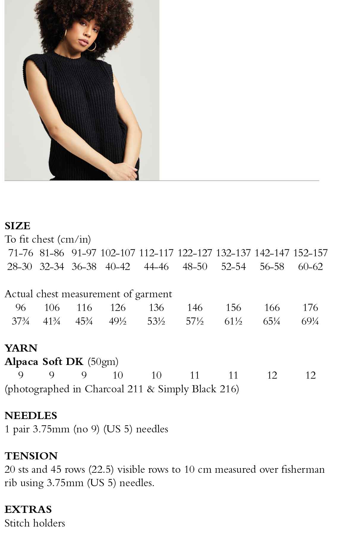 Add both practicality and style to your winter wardrobe with this versatile sweater vest from Quail Studio. Worked in fisherman’s rib with a relaxed fit, this is an everyday knit which will take you through the seasons. Knitted using Alpaca Soft DK, this chic vest has a flattering high neck which is a double thickness rib, a detail also echoed at the armbands.