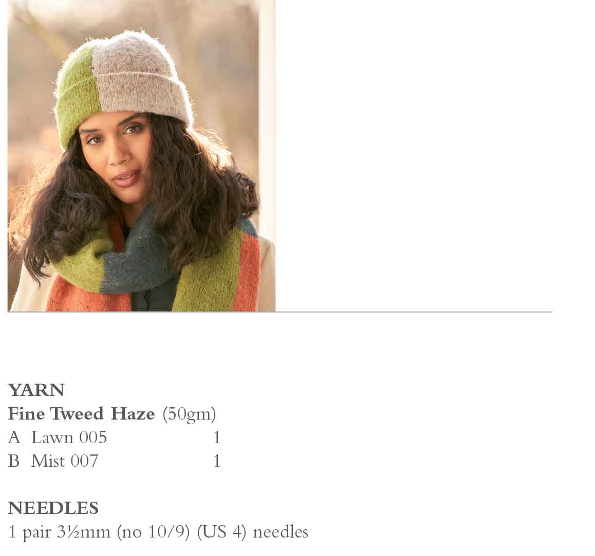 This stylish hat by Chloe Thurlow is knitted using two shades of Fine Tweed Haze. The bold colour block effect which extends all the way to the deep folded brim, is achieved using the intarsia technique.