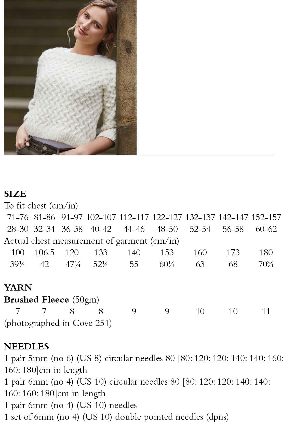 This carefully constructed cabled sweater from Katharina von Blumenthal is a cute, cropped knit with three quarter length sleeves. Worked in cosy Brushed Fleece, the body is worked in the round from the bottom up and then splits, with the top being worked straight. The sleeves are then picked up and knitted in the round.