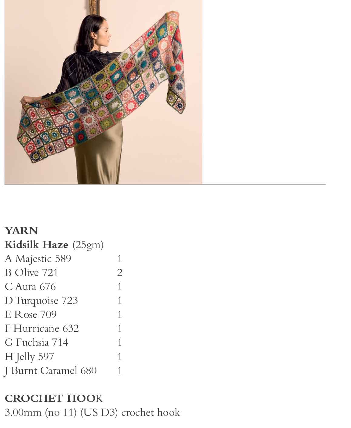 Add a pop of colour to your outfit with this stunning crochet shawl by Kim Hargreaves. 100 motifs are crafted individually and then joined together to form the overall shawl, creating a striking mosaic effect. Rectangular in shape, nine shades of Kidsilk Haze have been used to create this colourful, charming accessory.
