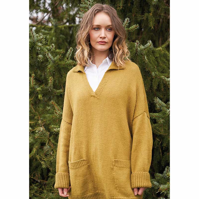 This oversized sweater is both a super-flattering shape, and length. A stylish, wide v-neck with a folded collar and handy deep pockets, this relaxed sweater by Lisa Richardson is an instant classic. Knitted in Alpaca Soft DK and bordered with a twisted rib and cosy turned back cuffs, this is a great layering piece for the colder months.