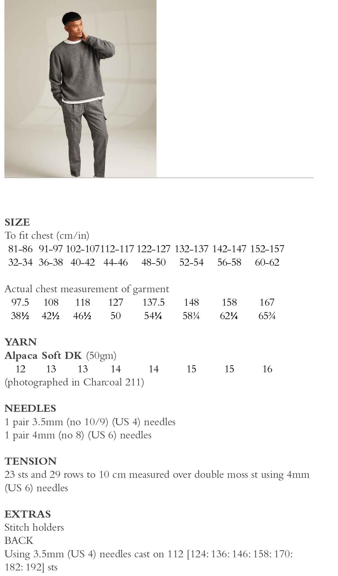 Chloe Thurlow has taken the classic crew-neck sweater and added a distinctive knit and purl texture. Purl stitch ridges are interspersed between deep bands of double moss stitch and trimmed with a simple rib. A great everyday layer for the cooler months.