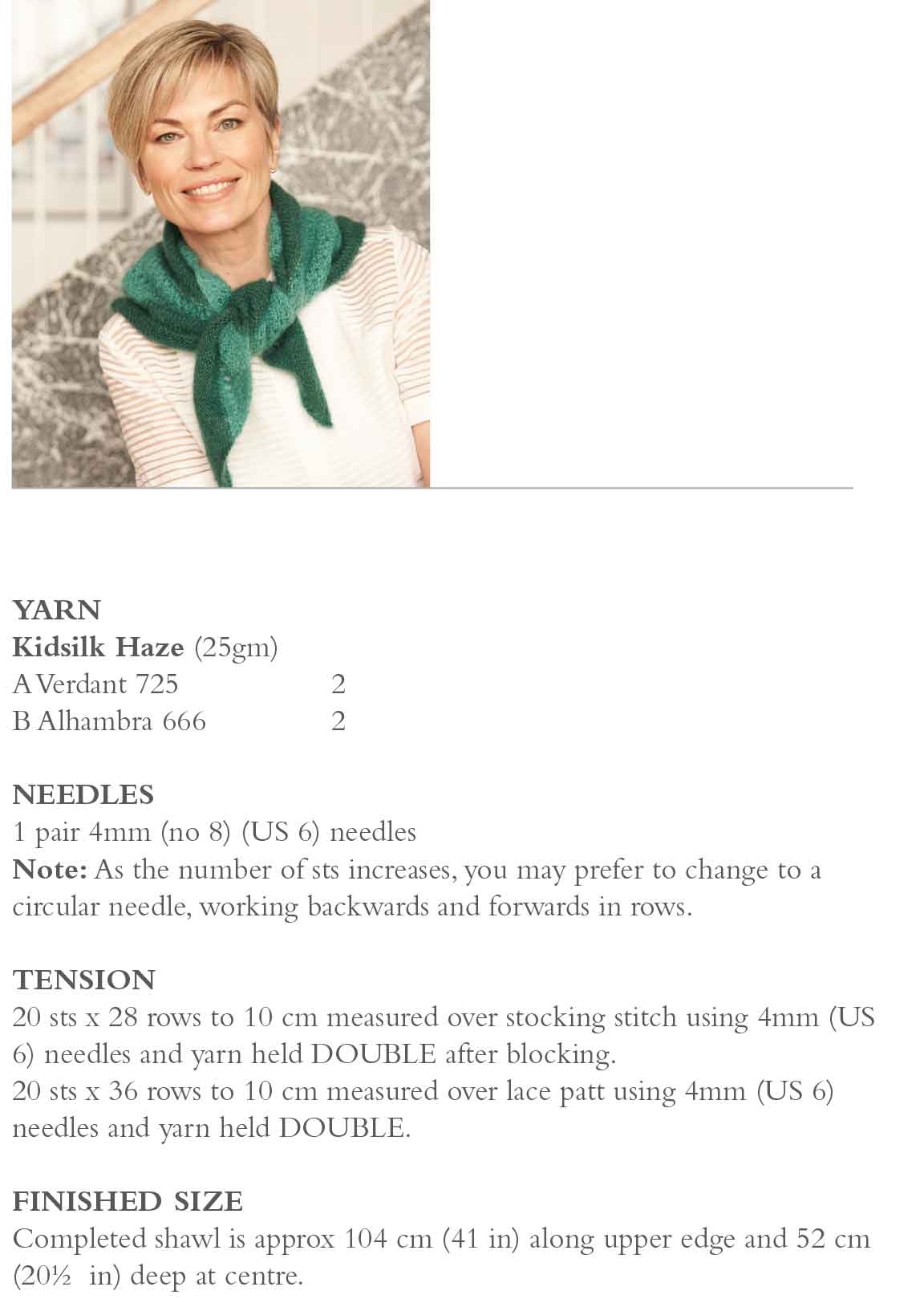 This pattern appears in Rowan Kidsilk Haze Accessories. Beautiful and interesting-to-knit accessories in the wonderful Kidsilk Haze, these designs are a joy to both knit and wear in equal measure. Designers Kaffe Fassett, Georgia Farrell, Lisa Richardson, Chloe Thurlow and Anna Hull combine simple stitches with a variety of shapes and techniques, intricate lace and stripes of colour to bring us a stunning collection of wraps, scarves, shawls and ponchos