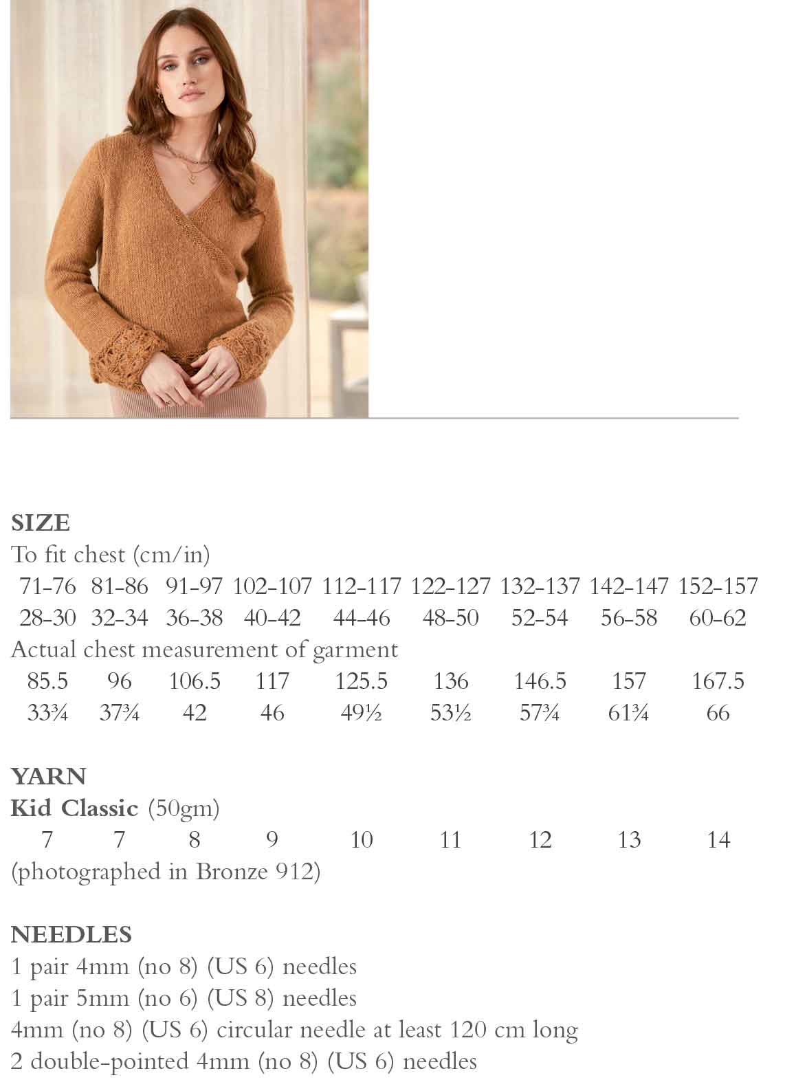 Versatile and stylish, this wrap-around cardigan from Martin Storey is knitted using the beautifully soft Kid Classic. Simple stocking stitch is exquisitely framed with an intricate lace and garter stitch edging around the bottom of the body and sleeves. The two fronts wrap around to create a flattering v-neck and it is finished off with pretty i-cord ties.