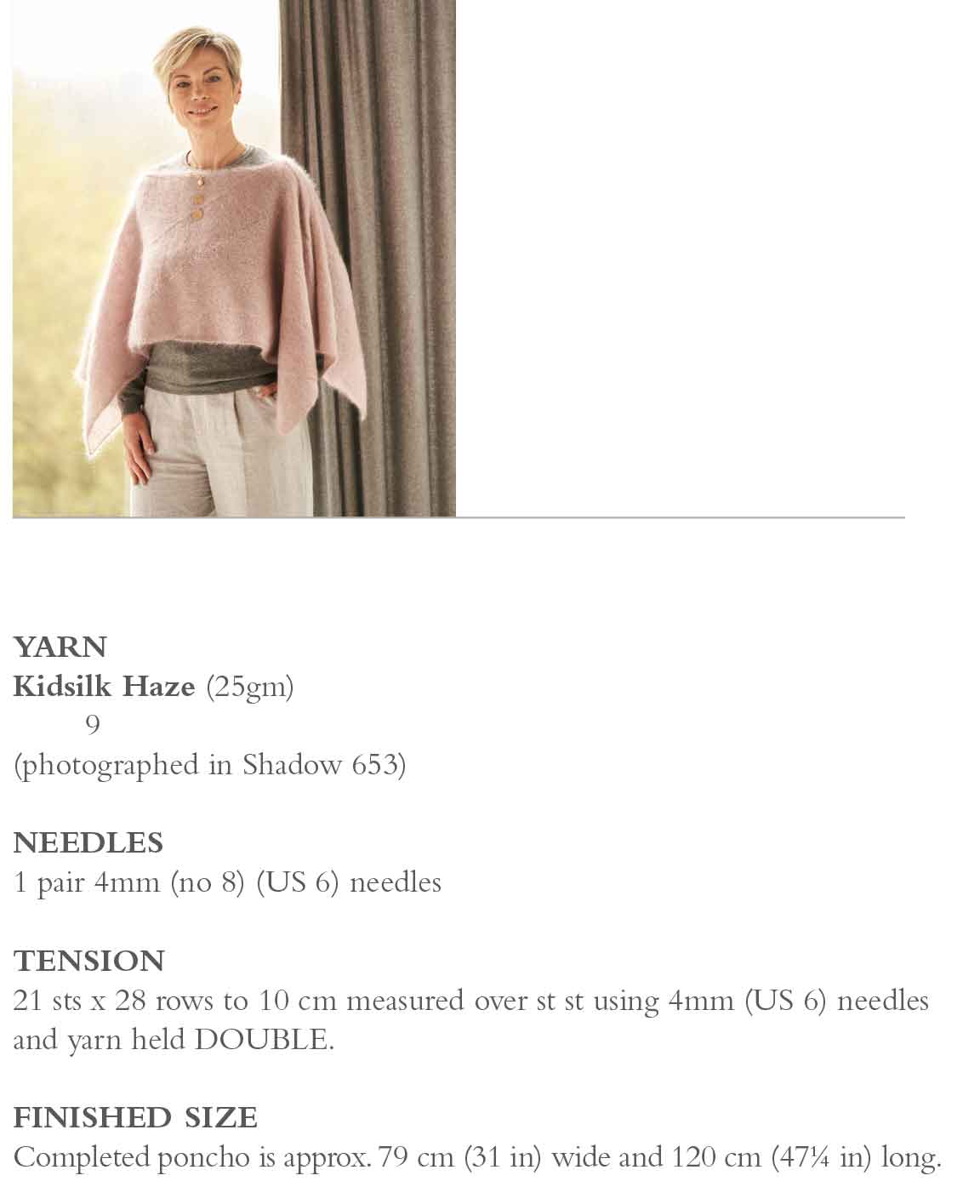 This pattern appears in Rowan Kidsilk Haze Accessories. Beautiful and interesting-to-knit accessories in the wonderful Kidsilk Haze, these designs are a joy to both knit and wear in equal measure. Designers Kaffe Fassett, Georgia Farrell, Lisa Richardson, Chloe Thurlow and Anna Hull combine simple stitches with a variety of shapes and techniques, intricate lace and stripes of colour to bring us a stunning collection of wraps, scarves, shawls and ponchos