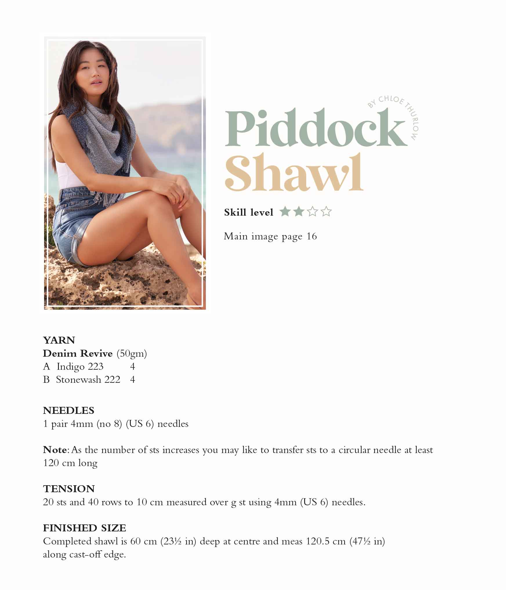 Summer accessories are a great accompaniment to the season and this charming shawl by Chloe Thurlow does not disappoint! Worked in two colours of recycled yarn, Denim Revive, this triangular, intarsia shawl is the ideal layer for combatting a cool summer breeze.