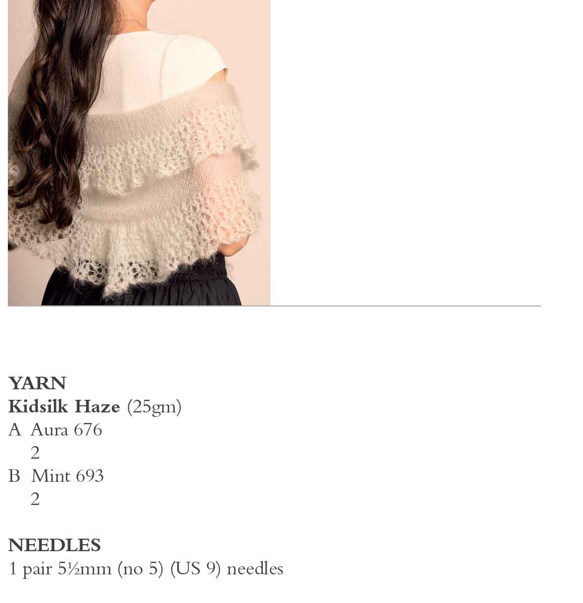 This graceful knit from Sharon Miller has an airy and lightweight feel. Knitted using two shades of Kidsilk Haze, the simplicity of the stocking stitch shawl is offset by the fabulous lace edging. The shawl drapes elegantly and exudes an ethereal charm, making it a great piece for adding a touch of delicate sophistication to any outfit.