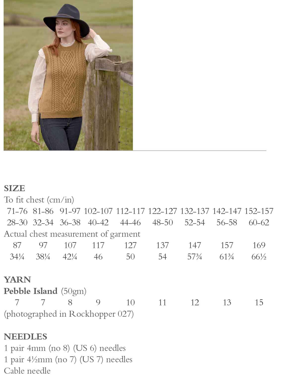 Martin Storey’s trademark cables adorn the front of this classic crew-neck tank top. Knitted using Pebble Island, this is a versatile knit that will take you effortlessly through the seasons. The plain back is slightly longer in length for a flattering finish.