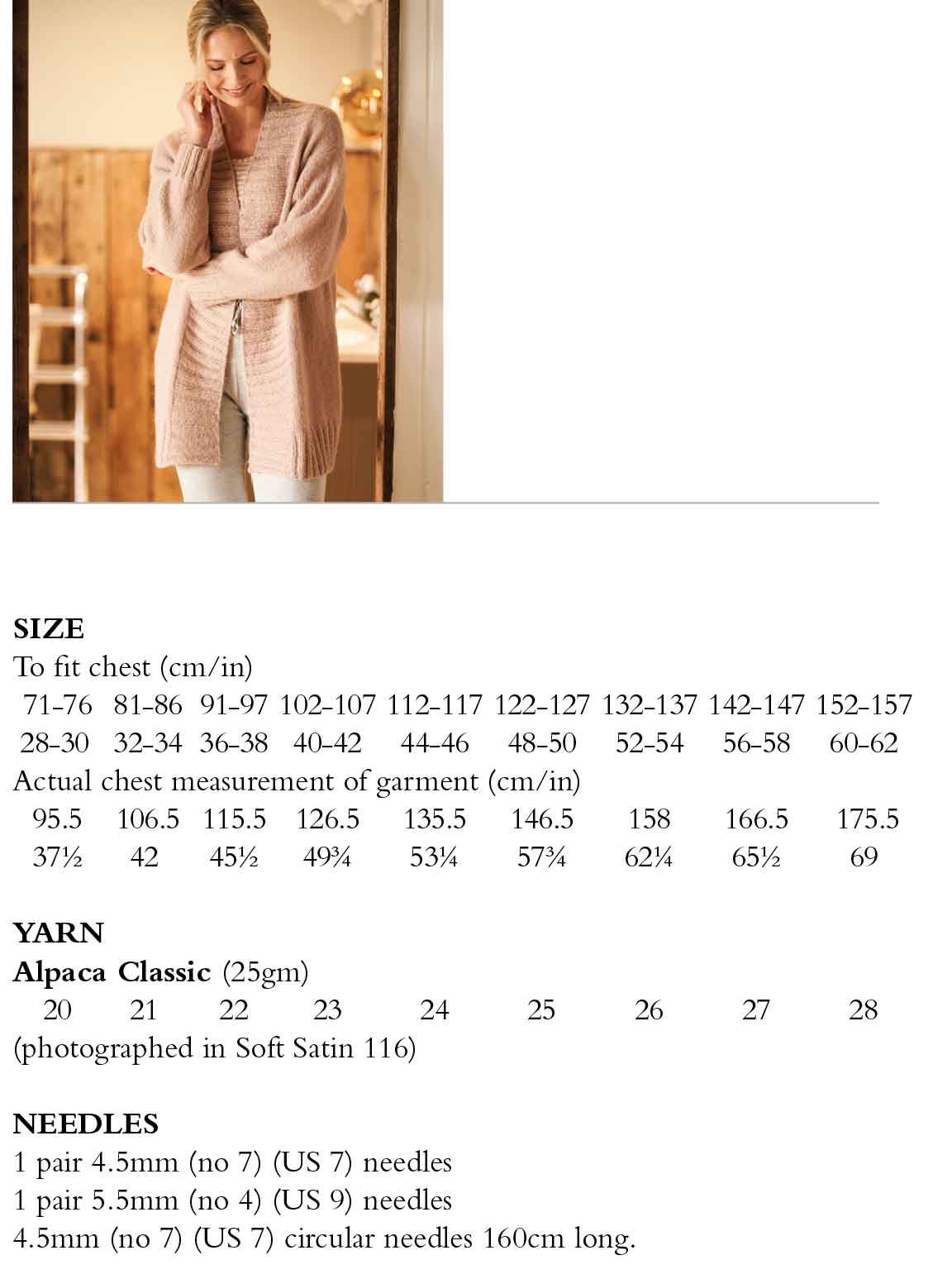 Effortlessly stylish, this long length cardigan with its wide ribs and tie belt, is a go-to winter knit. Perfect for throwing on as an extra layer, this gorgeous knit by Quail Studio uses Alpaca Classic held double for the ultimate in soft and cosy.